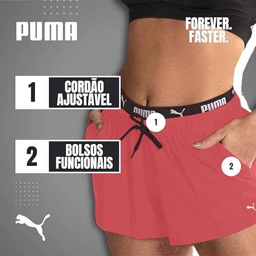 - Cós Elástico “Duplo”: Traz melhor fixação sem que o shortinho escorregue ou caia conforme o movimento, sendo que um dos elásticos é estampado com o logo “PUMA”, trazendo um toque autêntico e versátil para combinar com diversos estilos.